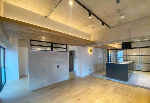 室内にフレーム窓を配置させることで、空間にアクセントができ、奥行きを感じさせることで開放感が出ます。採光や通風を確保できます。